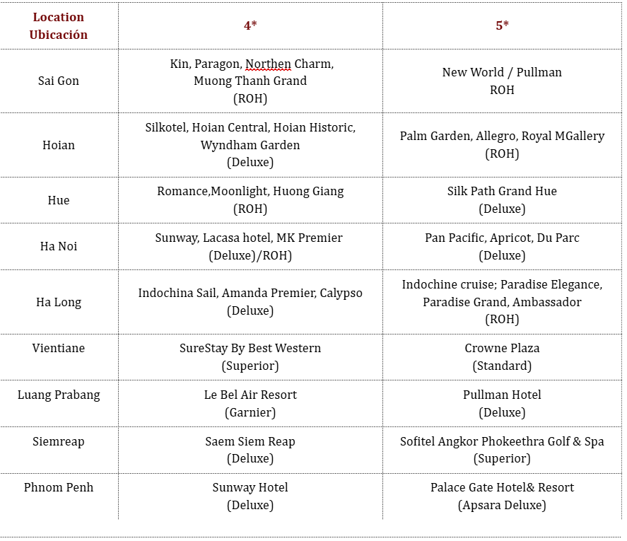 Los precios están expresados en dólares estadounidenses por persona, en base a dos huéspedes compartiendo habitación doble o twin en los hoteles mencionados.